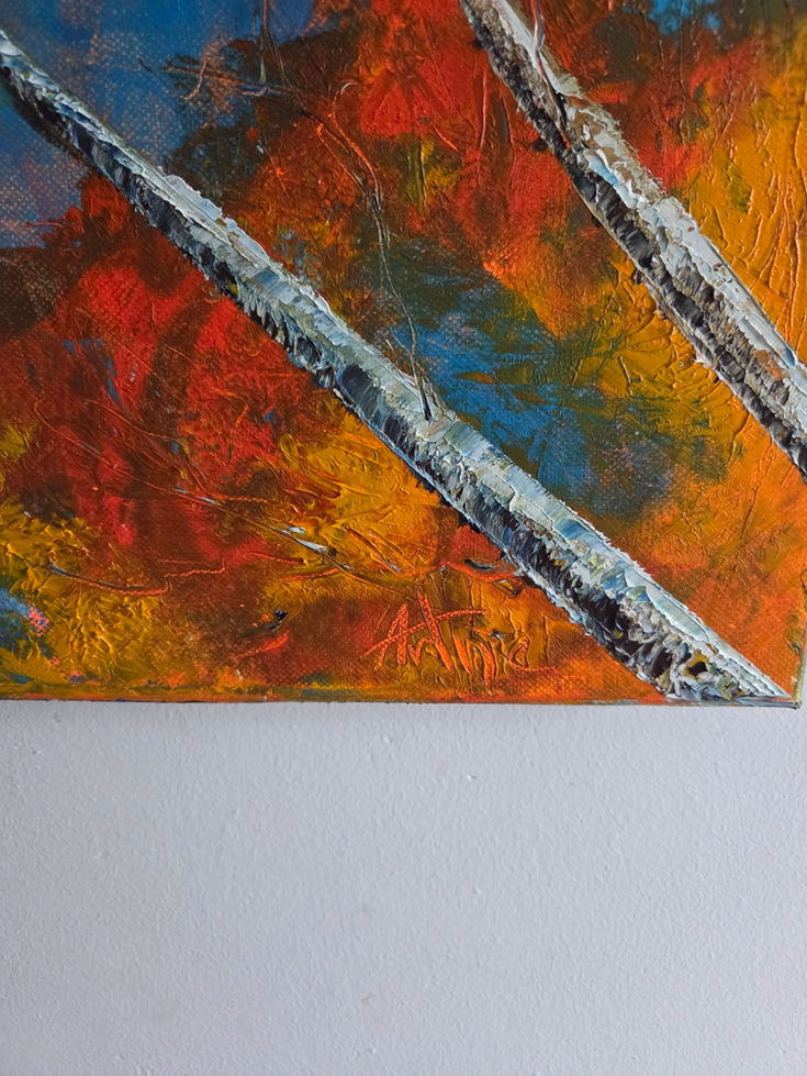 Avec cette œuvre, j'ai voulu capturer l'émerveillement d'un regard porté vers le ciel à travers les arbres en pleine explosion de couleurs d'automne. Les contrastes vibrants entre le bleu éclatant et les chaudes nuances d'orangé et de jaune transmettent une énergie vive et un souffle de liberté. Cette peinture invite à ressentir la grandeur et la beauté spontanée de la nature, apportant une lumière chaleureuse à votre intérieur.